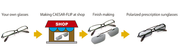Custom-made CAESAR-FLIP sunlenses can be cut in favorite shape to make change your spectral glasses to polarized sunglasses.